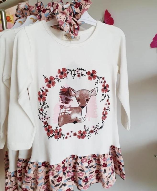 Трикотажна легенька сукня для дівчинки. В наборі резинка для волосся. 3-4 р Рукав - 30 см, шир - 28 см, довж - 49 см 4-5 р Рукав - 30,5 см, шир - 28,5 см, довж - 51 см 5-6 р Рукав - 34 см , шир - 30 см , довж - 55 см 6-7 р Рукав - 34 см, шир - 30,5 см, довж - 56 см