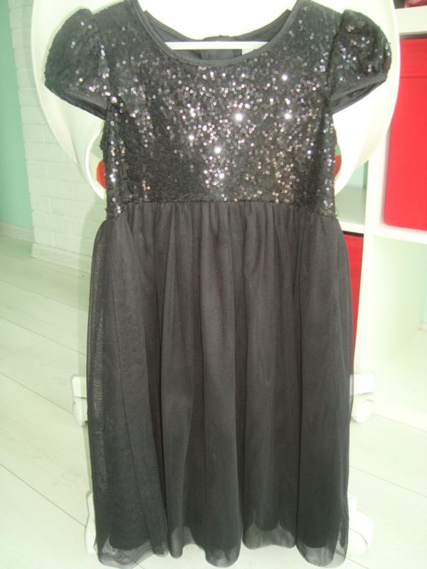 У продажу сукня для дівчинки бренду Inside, розмір по бирці вказано 122. Колір чорний. Ошатне плаття з тюля на підкладці, великий атласний бант можна зав'язати як спереду так і ззаду. По верху щільно розшито паєтками (є зовсім маленькі ділянки, де їх дещо не вистачає-непомітно). Довжина сукні-68см, напівобхват під ручками 30см. Стан сукні дуже добрий
