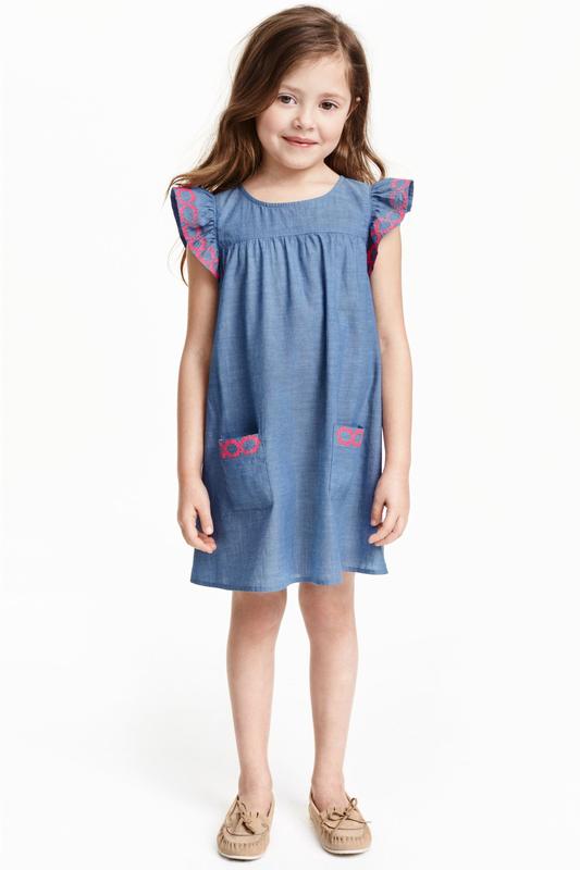 Платье из хлопковой ткани с вышитыми деталями, собранной кокеткой, короткими рукавами-бабочками, передними карманами и пуговицами сзади. Возраст 7-8 лет ПОГ - 39см Длинна - 64см