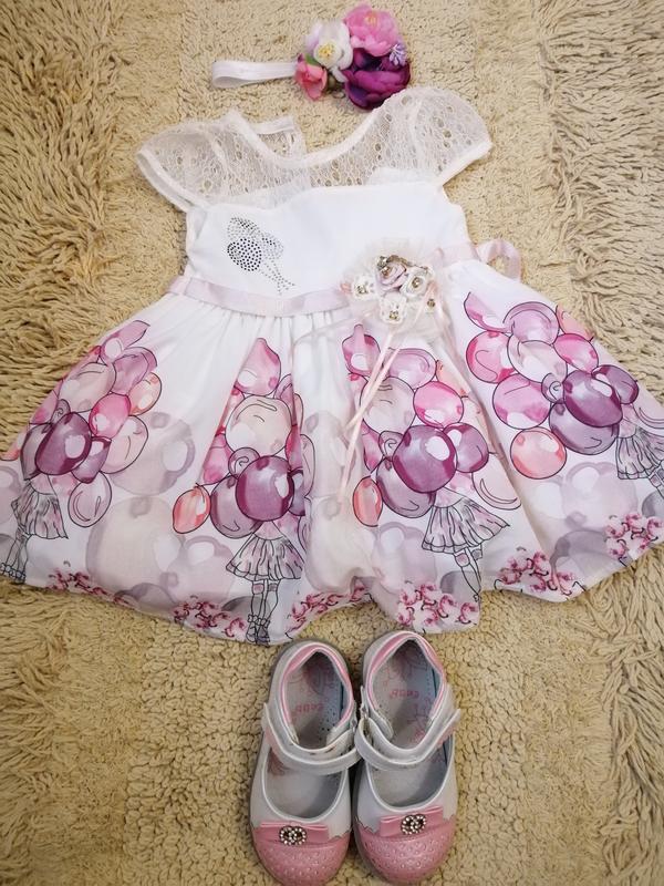Святкова сукня для принцеси 🌷возраст 9 мес -1,5роки🌷 Замеры: Длина 44 Ширина 24 Сзади замочек и завязка. +повязка в тон платья в подарок 🎁 Цена 270грн Туфельки лаковые, цвет молочный с розовым в идеальном состоянии. Обувь 22 размер, Стелька 13,5. Цена 230 грн