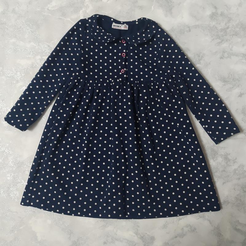 Очень удобное и качественное платье для девочки темно-синего цвета в белый горошек на 3-4роки на рост 104-110см. Замеры: ПОГ 29см, длина рукава 37см, длина платья 60см. Стан идеально. Склад: бавовна - 95%, еластан - 5%. Производитель: ТМ "Wanex", Турция