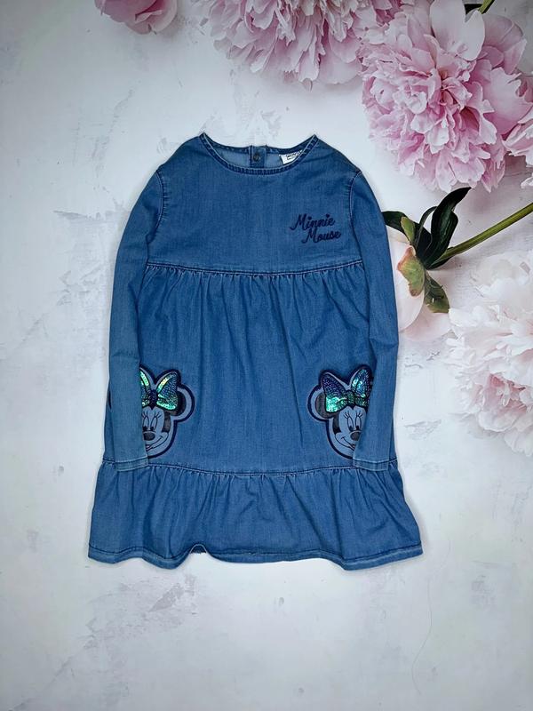 Легкое джинсовое платье Minnie Mouse Спереди карманчики Сзади застежка на кнопки 🏷️George 4-5 лет/104-110 Длина 58. ПОГ 33. Рукав 40