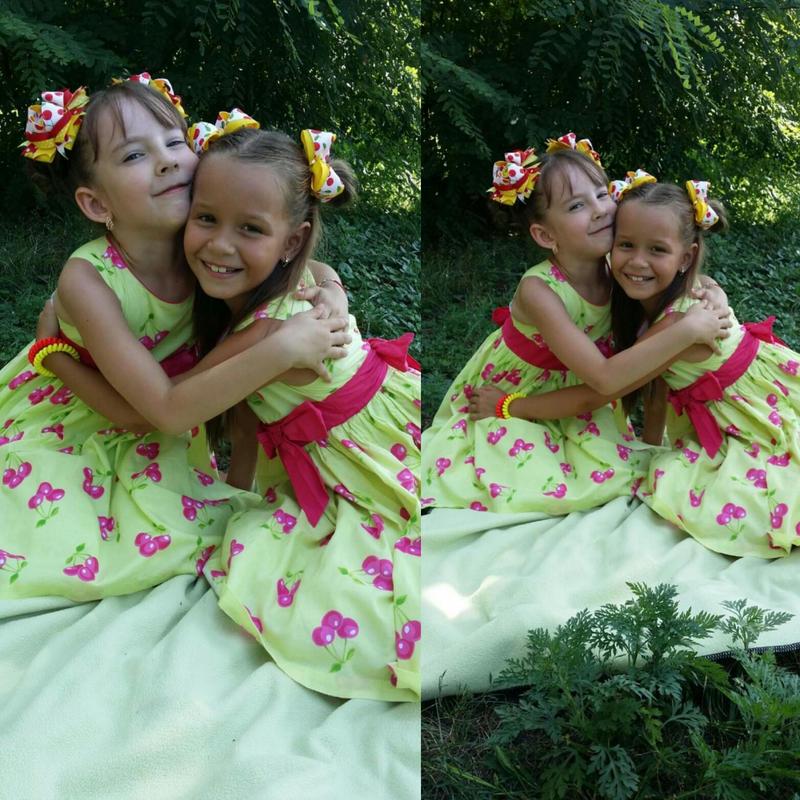 Красивое, нарядное летнее платье в вишеньки, а так же заколочки ручной работы к нему. В наличии один комплект. длина 64 см ширина 33 см, сзади на пуговках, с подьюпником. По бирке на 6-7 лет Благодаря своему фасону платье можно носить и раньше и дольше. Цена за платье 180 грн + банты 80 грн