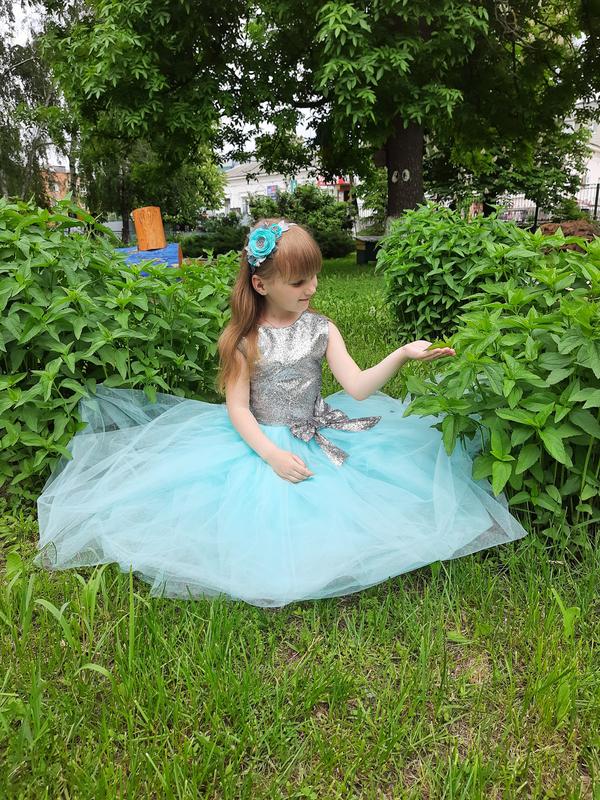 В идеальном состоянии, одевалась один раз на пару часов. На спинке регулируется утяжкой, поэтому подойдет с 5р. до 8р.. только длина будет разной. Замеры можно придать. В подарок на выбор обруч ручной работы подобран в тон платья. Длина общая 93см., длина юбки 60см., под ручками 30см.