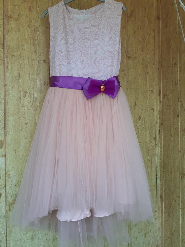 Праздничное платье ТМ Звездочка на выпускной в 4-м классе. Размер указан 158, но маломерит. Подойдет на 140-146. Можно как на стандартную фигуру, так и на плотничке девочку (топ из эластичной ткани, хорошо тянется). Платье декорировано лоентой собственноручно. Также дополнительно изготавливалась брошь (на пояс) и заколка (с беленьким кружевом). Очень красиво переливается камушок (фото полностью не передает). Нюанс (не заметный): верхний слой фатина с правой стороны поврежден браслетом (см. последнее фото) Замеры: Талия - 31 см Под мышками - 35 см Длина от плеча по пояс - 35см Длина юбки (фатин) спереди/сзади - 44/64 см !! К платью есть балетки нежно кремового цвета (переливаются). Длина стельки 23см.