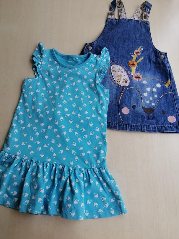 Продаж лотом. Фирменные платья на девочку 2-3 года. В хорошем состоянии. Цена за два 185грн. Джинсовый сарафан Mothercare, длина 51,ширина под руками 29,ширина по низу 41. Трикотажное платье Name it, длина 49,ширина под руками 29, внизу перед оборкой 31.