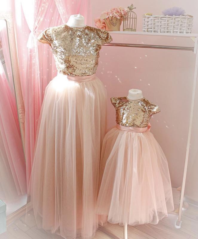 Нарядное платье в пайетках рр. 7-9 лет Можно приобрести отдельно взрослое 1800 и детское 1200 грн. Платья подойдут на випуск, банкет, карнавал ,торжественную вечеринку. Выполнены верх в золотисто бронзовых пайетках низ из подкладки и шифона 6-5 ярусах. Бантик на поясе съёмный. длина от плеча 101 см., ПО пояс 31 см., затягивается до нужного объёма., плечи 32 см. Взрослое платье : рр.S-M длина от плеча 150 см., длина рукава от плеча 47 см., ПО под мышками 44 см.. ПО талия 37 см., затягивается сзади поясом до нужного объёма. плечи 40 см.