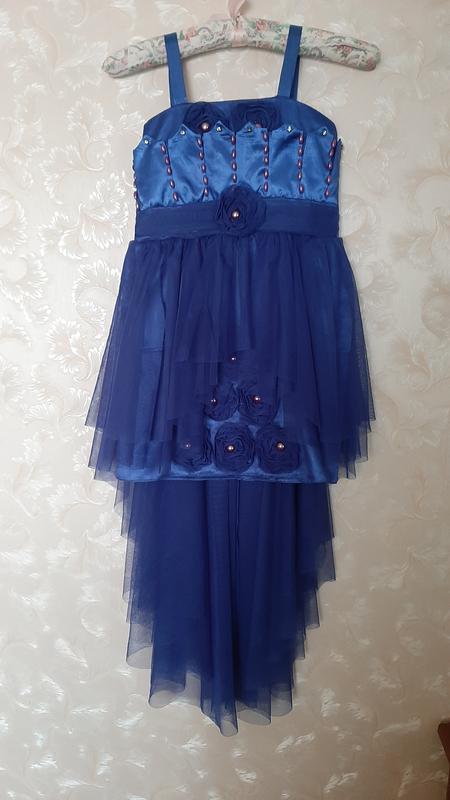 Святкова, оригінальна сукня синього кольору, виробник Турція, розмір вказаний 9 років. Основа пряме (тканина типу атласу) коротке, позаду шлейф з фатину, на бретелях, по спинці резинка, застібка молнія. Прикрашене, трояндами з фатину, камінцями і перлинками рожевого кольору. Дефектів не знайшла, вдіто 2 рази для фотозйомки. Сукня цікавого крою, дитина в захваті)