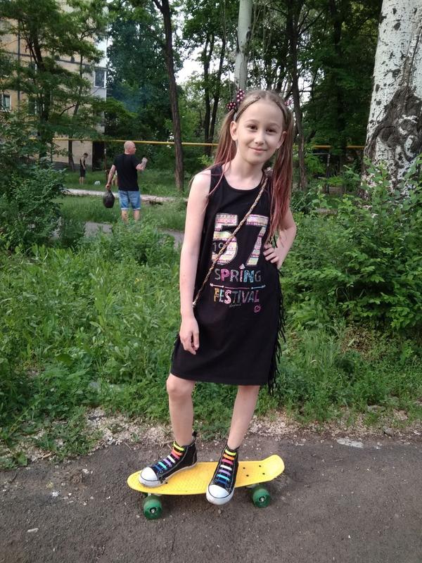 Сукня на дівчинку 8-9 років, в залежності від комплекції. Перешивала з речі розрахованої на 14 років. Виглядає дуже круто. Ширина - 33 см. Довжина - 70 см. Якщо зацікавитесь, кеди та "борд" також в продажі.
