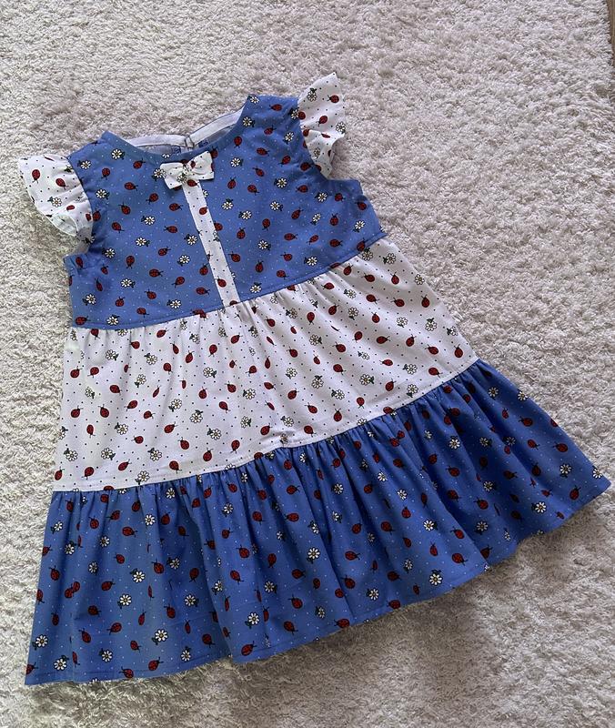 Яркое платье на девочку 4-5 лет Материал - хлопок 100%. Длина платья - 55 см, пог - 34 см, длина сверху до юбки - 22 см, длина юбки - 33 см, по плечам - 25 см, плечо -5 см.