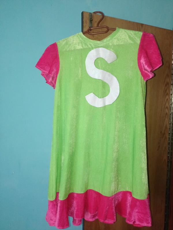 Велюровое платье для девочки свободного кроя.. Буква S пришита, можно отпоротить. Купили для выступления в танцевальной группе. Подходит на возраст 6-10 лет. Ширина по плечам -34 см, ПОГ-43 см, длина -75см.