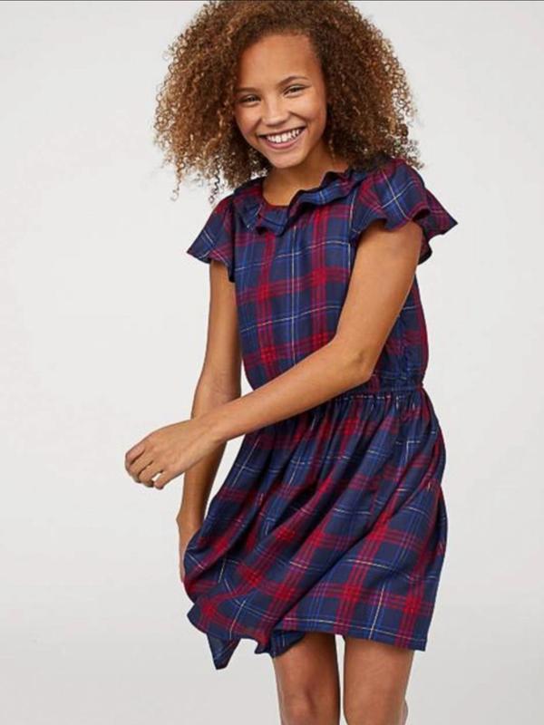 Сукня з віскозної тканини з оборками навколо декольте і ґудзиком ззаду на шиї. Короткі хвилясті рукава, еластичний шов і бантик на талії. Склад: Віскоза 98%; Поліестер 1%; Металізоване волокно 1%