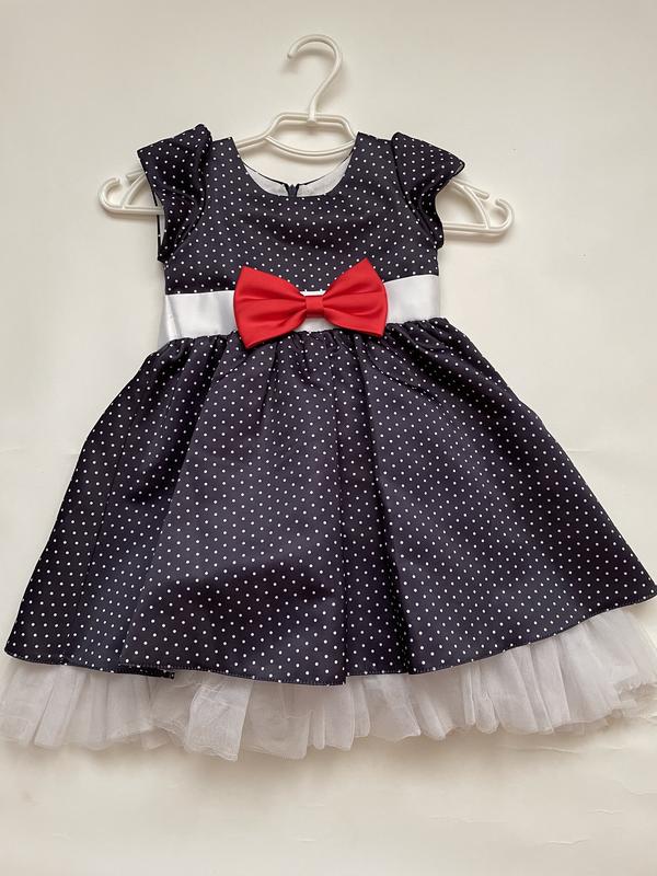 Дуже гарне плаття в горох. Пишне , завязується ззаду на великий бант. На 3/4 /5 рочків Довжина 54 см+ фатін 6 см Ширина 27 см Плечі 22 см