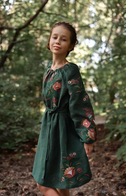 Льняное зеленое детское платье-вышиванка красивое вышиванка детское платье из льна зеленая