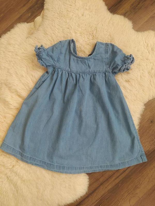 Синее джинсовое платье для девочек George, р 92-98, 2-3 года Имеет красивые рюши вокруг руковив, завязывается на бант на спине. 100% коттон (тонкой плотности). Длина платья 51 см.