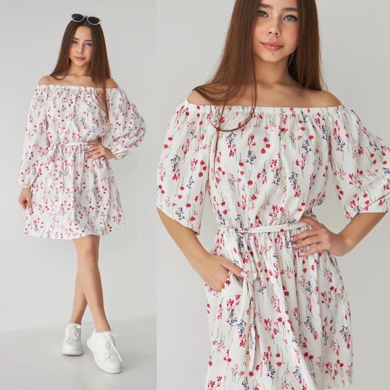 Таня Надзвичайно ніжна сукня для красунь в квітковий принт по талії під резиночку та поясок рукавчик лізтариком рукавчик та верх також під резинку є кишені Тканина супер софт РЕКОМЕНДУЮ! зріст/довжина по середині/пог/рукав повна довжина похибка+-2см 140/64/42/46-1шт 146/67/43/47-2шт