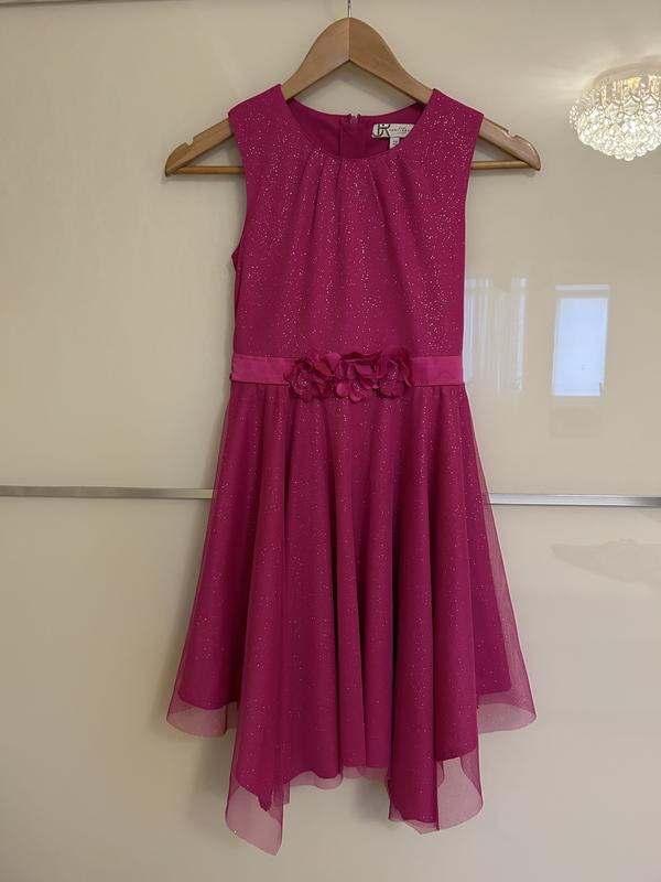 Нарядна сукня в ідеальному стані на р. 134-140, гарно сидить по фігурі, колір, як на фото- ближче до фуксії. Довжина 80, ширина під руками 36, пояс 33, плечі 30.