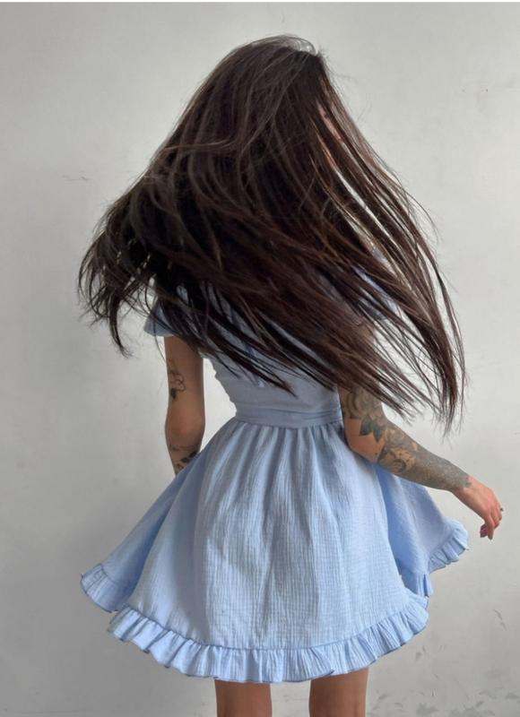 Новейшее муслиновое платье на девочку подростка.На 10-12 лет Длина 77 Пояс до 34, можно стянуть пояском Бедра свободно Грудь до 36