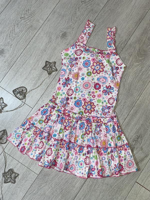 Платье в цветочный принт для девочки Длина вместе с бретелями 69 см. Пог: 32 см. Сзади застегивается на молнию.