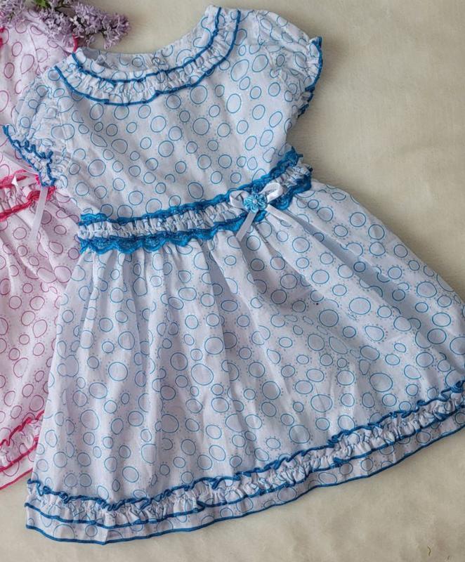 Легкое летнее платье для девочки из хлопка (батист). Сзади платья кнопочки и поясок, благодаря которому можно регулировать ее объем. Размер: розовый цвет - 52 (рост 86-92см) синий цвет - 56 (рост 92-98 см)