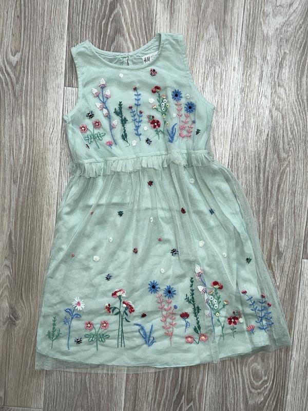 Платье мятного цвета с вышивкой Подкладочная ткань хлопок Состояние отличное 🏷️H&M 4-5 лет/110 Длина 68(25). ПОГ 32