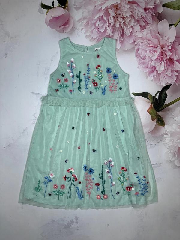 Платье мятного цвета с вышивкой Подкладочная ткань хлопок Состояние отличное 🏷️H&M 4-5 лет/110 Длина 68(25). ПОГ 32