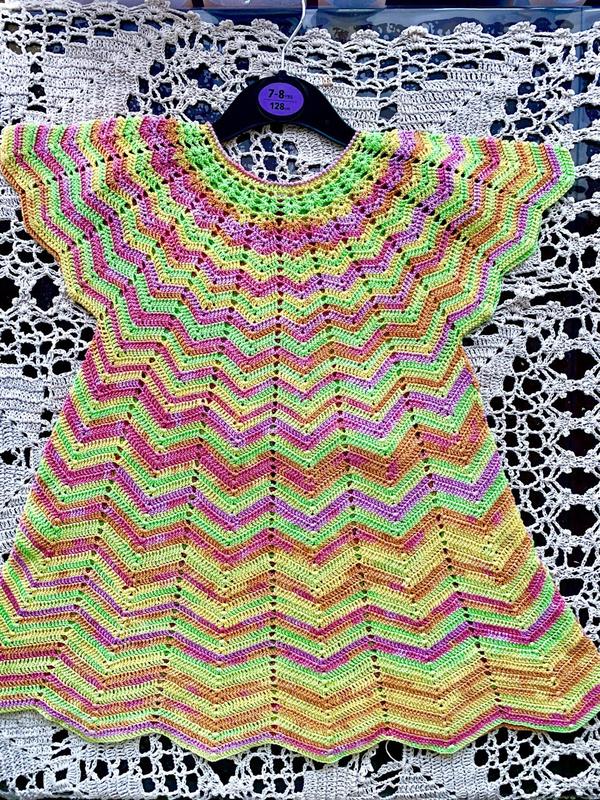 Вязаное платье для девочки на 7-8 лет из натуральной нити - турецкого мерсеризованного хлопка. В жару не парит, а дарит прохладу. Сзади застежка на пуговицы. Вязаное с любовью. Длина - 57 см., ширина в районе груди - 32, по бедрам идет свободно.