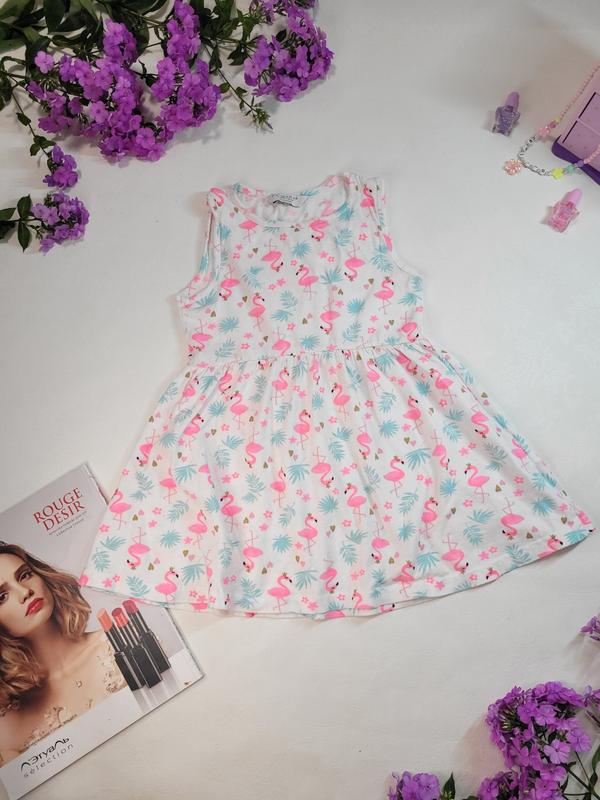 Легка сукня з принтом фламінго. Стан ідеальний. Вказано зріст 116, але як на мене трохи коротка на цей зріст. Вдягали в 4 роки на зріст 110. Носили мало, колір не змінився, дефектів немає.
