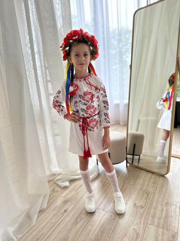 Неймовірна сукня- вишиванка! Вишивка- нитками. Пояс в комплекті. Якість- відмінна! Тканина -бязь, бавовна. Розміри: 104 – рукав від горла 34, довжина 48 110 – рукав від горла 38, довжина 51 116 – рукав від горла 39, довжина 55 122 – рукав від горла 40, довжина 57 128 – рукав від горла 42, довжина 58 Ціна: 700 грн