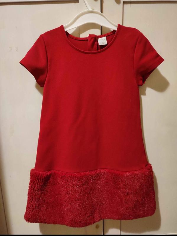 червона сукня з обробкою зі штучного хутра Вона має прямий крій (трапеція), короткі рукави та прикрашена пухнастим штучним хутром по нижньому краю. Дуже гарне плаття Плечі 30см Пог 35см Довжина 70см 2