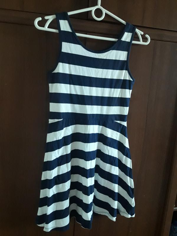 Нова сукня Next. 11років/146см. Орієнтуєтесь на зріст дитини- 146см 95%-бавовна. 5%-еластан Заміри: Півобхват по грудях-36см Півобхват по талії-34см Довжина сукні-77см