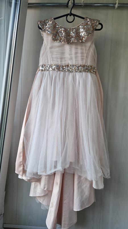 Платье фатиновое, спереди короче, сзади длиннее, застегивается на молнии и фиксируется поясом. Пояс и воротничок из пайетки, на юбке фатин с блестками, на солнце и при освещении очень красиво переливается. в идеальном состоянии.