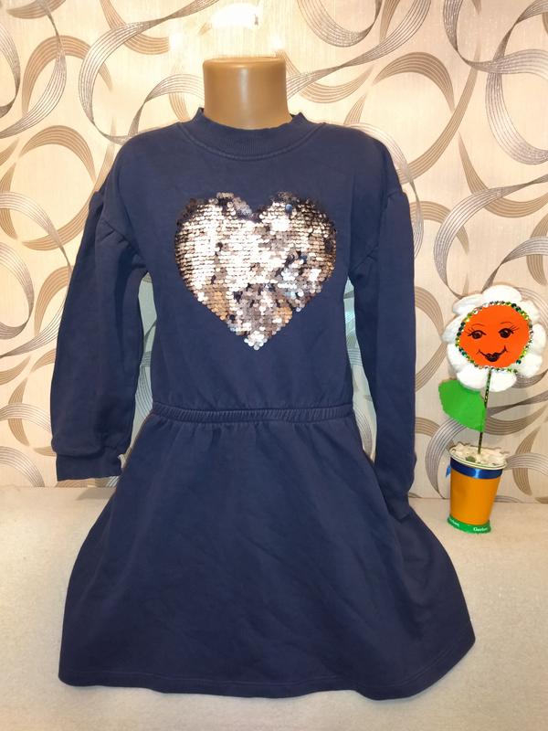 Теплое платье с начесиком на девочку от Tu,возраст указан 8лет(128р).Цвет синий.Спереди идет сердце из пайеток-перевертышей.Состав:73%-коттон,27%-полиестер.Без нюансов.Замеры предоставлю по требованию
