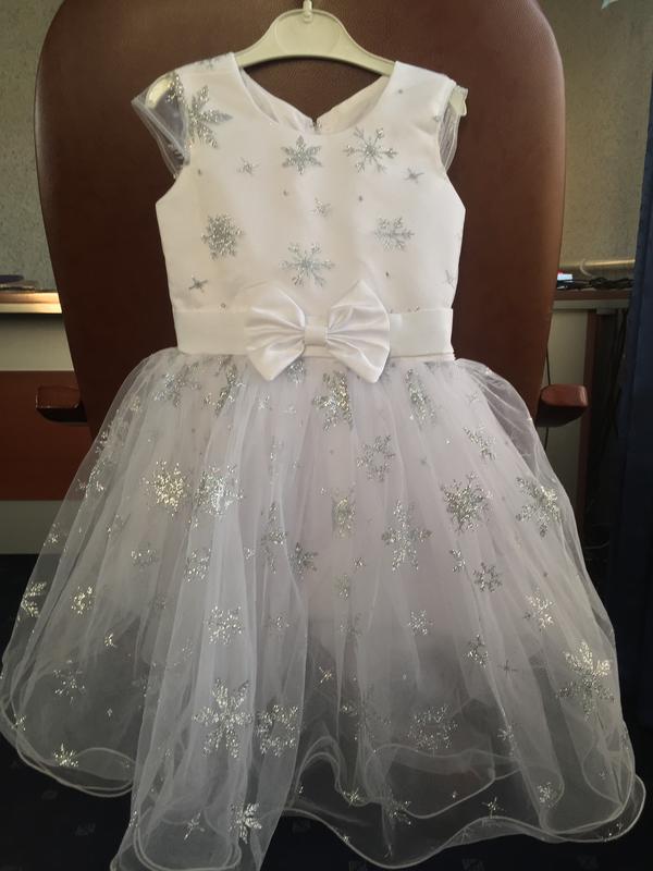 Платье нарядное «СНЕЖИНКА», для настоящей ПРИНЦЕССЫ на новогодний утренник. Блестящие снежинки на платье. Размер 104-110. Замеры: Полуобьём (там где бант) - 31 см. Длина по спине от самого верха замочка, к самому низу - 67 см. Обруч для принцессы идёт в комплекте.