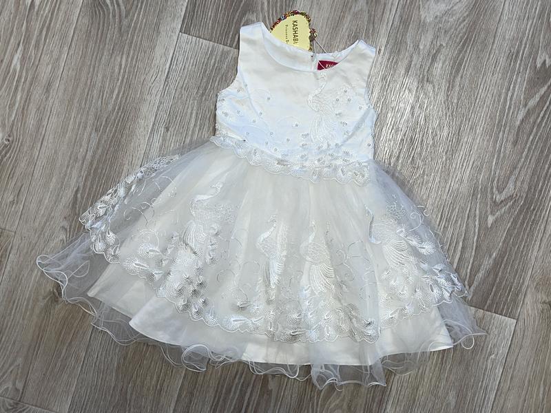 Шикарное, пышное платье белого цвета с оригинальным узором. Украшено бисером и вышивкой. Застегивается сзади на змейку. Завязывается бант. Новое 2 года Длина 56(21). ПОГ 27