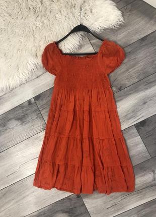 Яркое (моркв ⁇ го цвета) Очень красивое 100% котон Девочка 10 лет На груди имеет прорезиненную часть А потом идет свободное