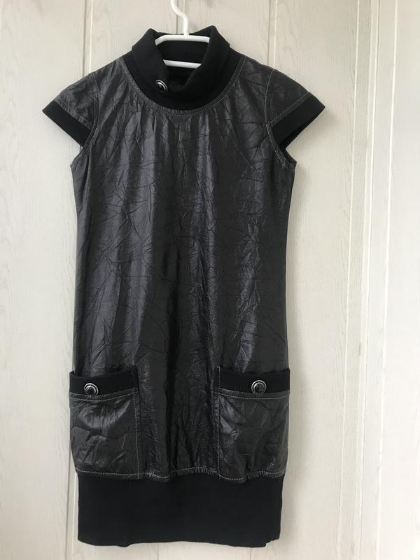 Модное платье с имитацией под кожу для девочки 11 лет. Украшена пуговицами. Цвет черный. Под платье можно надевать боди с рукавом, или гольф. В хорошем состоянии.