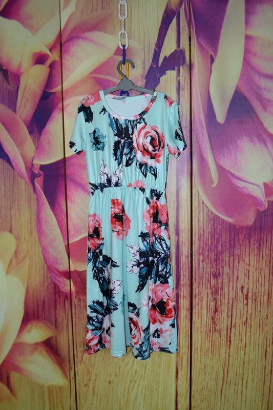 Сукня з квітами. Довга. Тканила легка, приємна, гладенька. р.110: груди п/о - 33 см, пояс п/о - 25 см (резинка ), довжина - 82 см ( по спинці) Склад: 65% котон, 35% полиестер