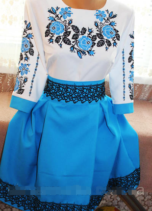 Сукня вишиванка "Блакитна троянда" Машинна вишивка хрестиком в комплекті пояс оздоблений мереживом, також мереживом оздоблена сукня по низу Рукав 3/4👈 Виготовлено в Україні Тканина габардин. Довжина виробу- 90 см плечі- 37,5 см рукав від плеча (3/4)- 48,5 см обхват грудей 90 см талія сукні 77 см пояс 70 см верх від плеча до талії 40 см від талії до низу 50 см .