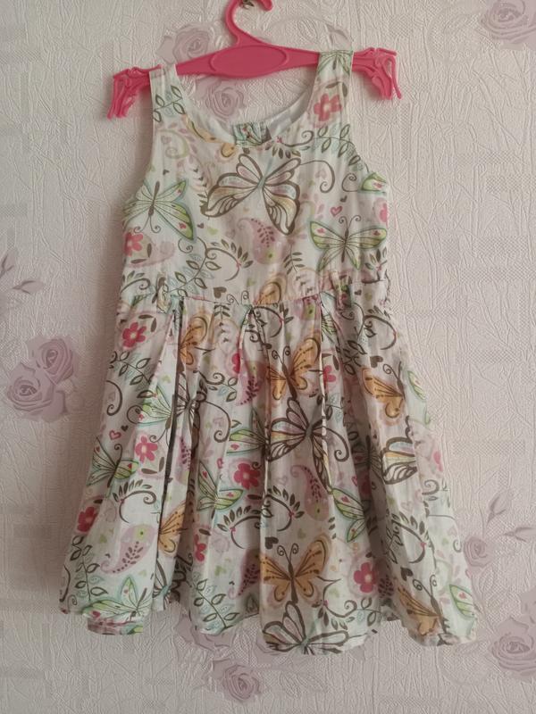 Летнее красивое платье на 4-5 лет. Хорошее состояние (есть нюанс на подюбнике, который не виден, там желтенькие два пятнышка.) Интересный принт в бабочки, за Фен Шуем красивый символ легкости, хорошей жизни. Замеры: длина-58см, ПОГ-31см. ПОТ-29см. Пришла новой почтой после оплаты на карту.