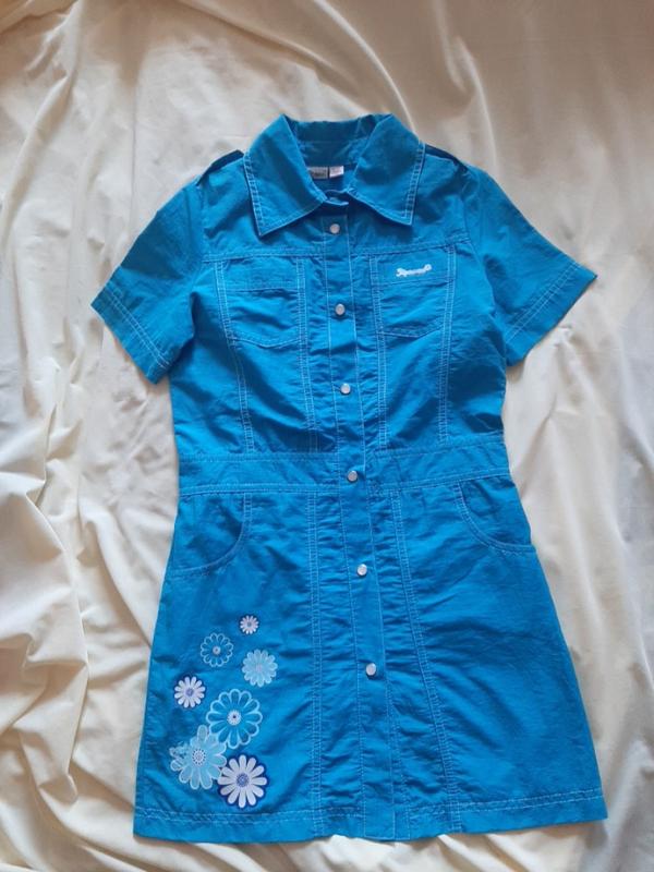 Голубого цвета на кнопках с карманами, на 146 см: ПОГ - 38, ПОТ - 34, ПОБ - 40, длина - 70, плечи - 32, рукав - 18, есть нюансы на аппликациях в 2 местах, не бросается в глаза.