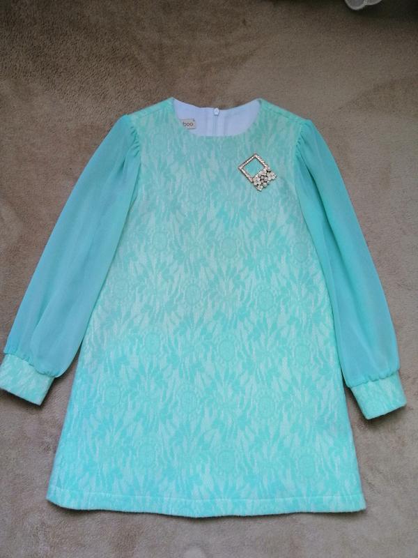 Сукня святкова, тепла. Основа - шерстяная ткань на подкладке, рукава - шифон. Цвет - мята, фото 3 лучше передает. Украшение можно легко снять по желанию, держится на нескольких ручных стежках. Одягали один раз. Длина изделия - 61.5см, длина рукава - 44.5см, плечи- 26.5см, полуобхват груди - 33см.