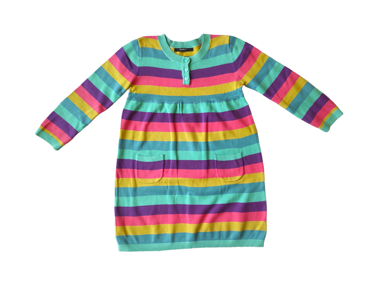 Сукня яскрава полосата George 5-6/110-116. Будет значительно дольше. Подстроилась по шву. Замеры: рукав 40 см + плечо 6 см, пог 34 см, пот 40 см, пос 45 см, длина 63 см.