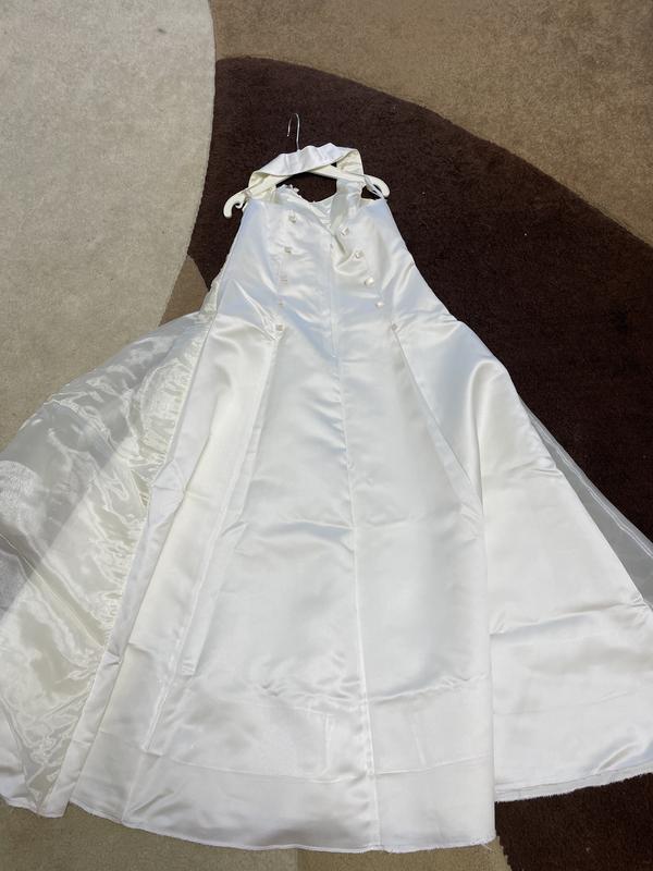 Детское выпускное платье цвет бело кремовый Замеры охват груди 74см +утяжка сзади шнурками подойдет на любой объем охват талии 64см полная длина 115см платье в пол липучки застегиваются на шее шнуровка сзади материал юбки плотный атлас сверху органза платье целое, без пятен, без стрелок все носили аккуратно