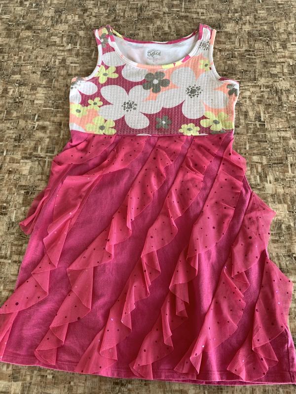Нарядное трикотажное летнее платье для девочки без дефектов и затяжек. Спереди расшитое прозрачными пайетками, не колется, так как имеет подкладку в этом месте. По низу также небольшие блестки. Пол Ог 36см Пояс 34см длина 74см