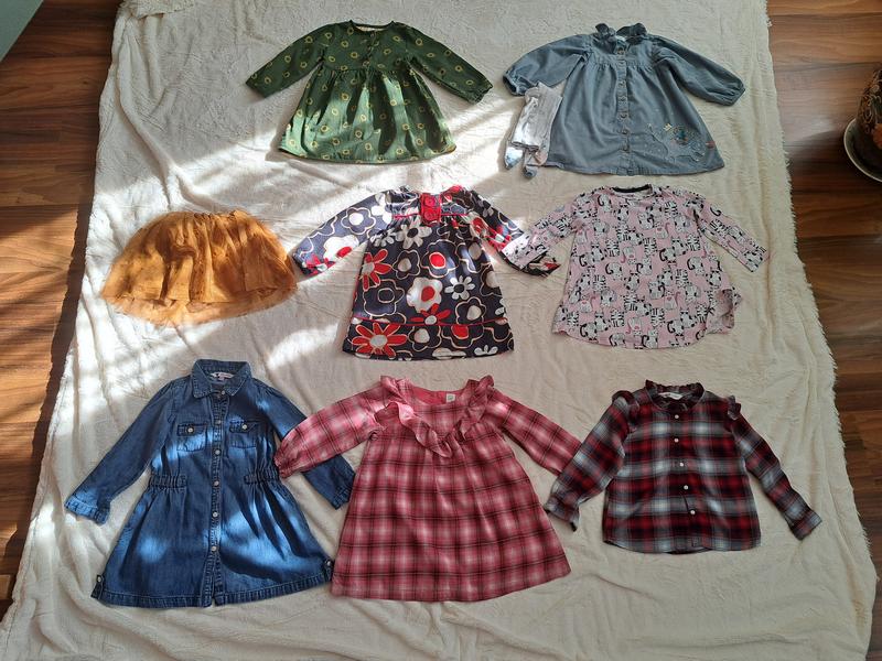 всі розміри на 2-3роки. одна сукня на 2 роки.але воно підходить на 3 роки. фірмові next,kiabi,H&M,Gap,lc waikiki 6 сукні,1 юбка і одна рубашка