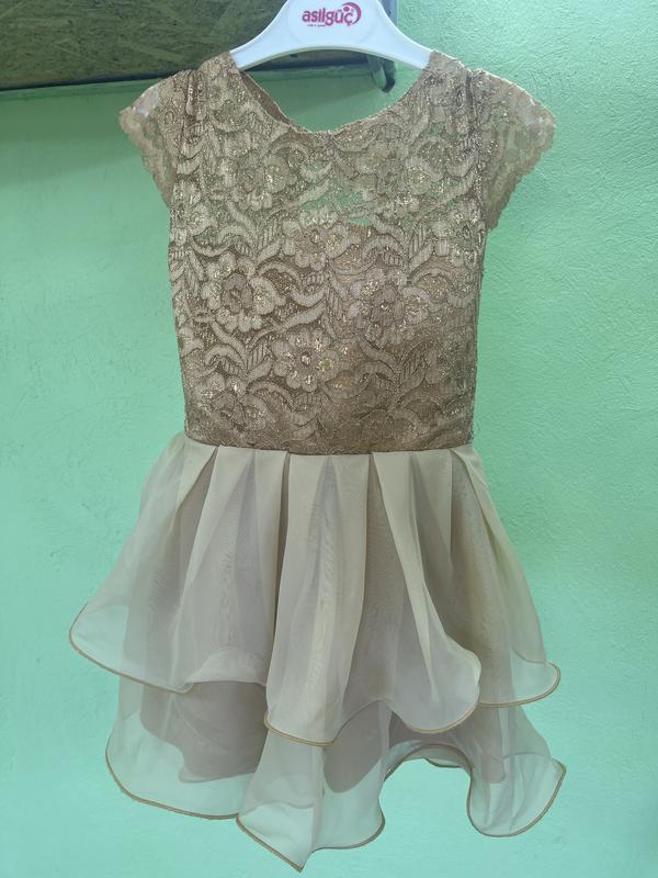 Очень красивое платье в золотом цвете на девочку 3-4 рочки. Юбка фатин, снимается. Длина платья -53 см. Пояс- 23 см. Корсет регулируется.