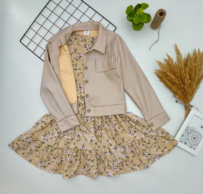 Модный комплект для девочки Ткань куртки эко-кожа, сукня софт платье под поясок с коротким рукавчиком по спинке молния рукавчик под резиночку рекомендую!!! рост/длин. платья/пог/длина куртки/пог/рукав похибка +-2см 140/70/32/42/40/49-1шт ------------------- Арт Ир