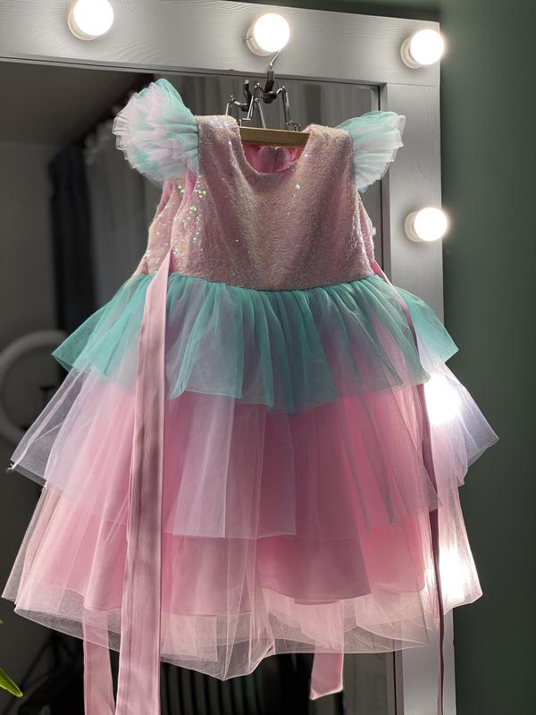 Нежное, красивое платье принцессы не оставит равнодушным вашего ребенка и окружающих. Верх платья - ткань с паетками, подклад - хлопок. Низ - качественный фатин, атлас, под ним ещё один подъюбник со вставочкой фатина сеточки. Платье пышное и в тоже время лёгкое. Ориентируйтесь не на размер, а на замеры платья, так как у каждого ребенок индивидуален. Например, моей племяннице на 6 лет по параметрам подошёл 150, но опять же у каждого ребенка свой размер. Кто-то выше, кто-то ниже, объяем талии тоже свой. Все замеры сделаны снаружи. Делайте небольшой запас ребенку. 3 года (110) - топ 20 см, ширина под ручками 27 см, талия 26 см, высота платья 57 см вместе с фатином (без фатина - 51 см) 4-5 лет (120) - топ 21 см, ширина под ручками 30 см, талия 29,5 см, высота платья 63 см вместе с фатином (без фатина - 58 см). 6-7 лет (150) - топ 26 см, ширина под ручками 36 см, талия 35 см, высота платья 77 см вместе с фатином (без фатина - 72 см). Обруч в комплект не входит, его можно приобести отдельно. В наличии и обруч Единорога, крылья. Смотрите следующие мои объявления, где найдете модели ободков единорога ручной работы, а также крылья.