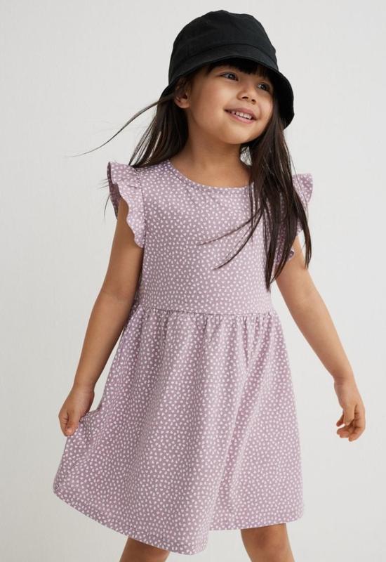 Сукня H&M в сердечка Сукня з м'якого бавовняного трикотажу. Модель з рукавами-метеликами та еластичним швом із зібраним малюнком на талії. Матеріал - 100% бавовна Розмір - 110-116 см